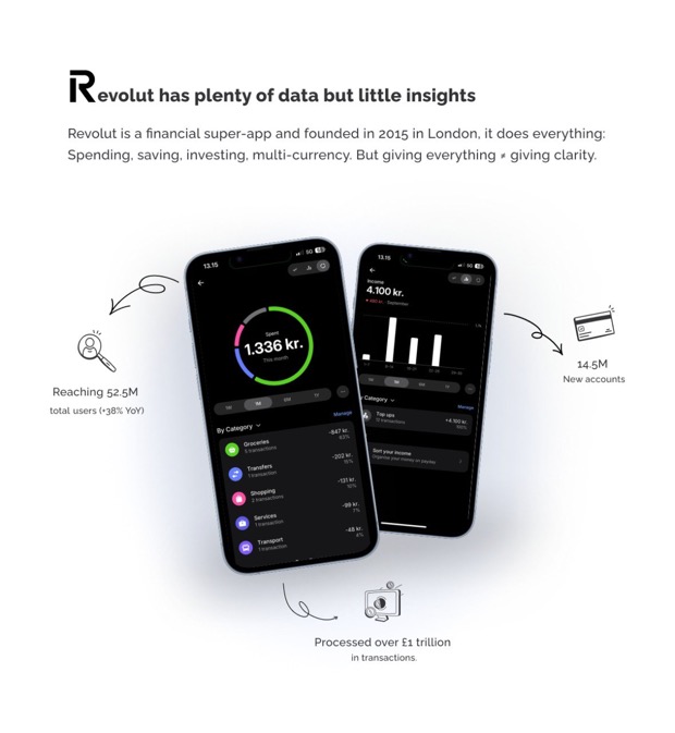 Revolut users struggled to make sense of raw transaction data. We redesigned the analytics dashboard to surface meaningful insights across income, spending, budgeting, and travel, helping users make confident financial decisions.